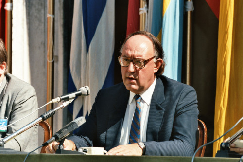 Ritratto di un uomo durante un intervento al convegno presenziato da Giulio Andreotti, in occasione del Convegno internazionale "Giornate delle genti e delle regioni d'Europa" (Venezia 14-21 settembre 1986) promosso dalla Regione del Veneto con la collaborazione della Fondazione Giorgio Cini e de La Biennale di Venezia.