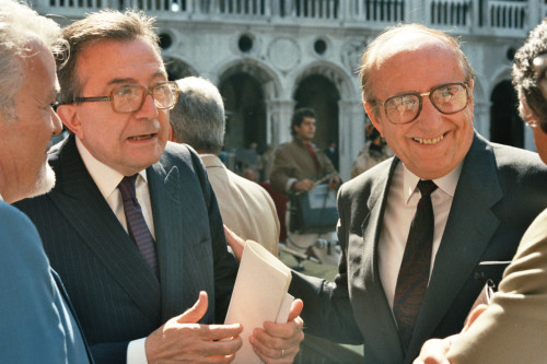 Giulio Andreotti, circondato da alcuni personaggi maschili in occasione del Convegno internazionale "Giornate delle genti e delle regioni d'Europa" (Venezia 14-21 settembre 1986) promosso dalla Regione del Veneto con la collaborazione della Fondazione Giorgio Cini e de La Biennale di Venezia.