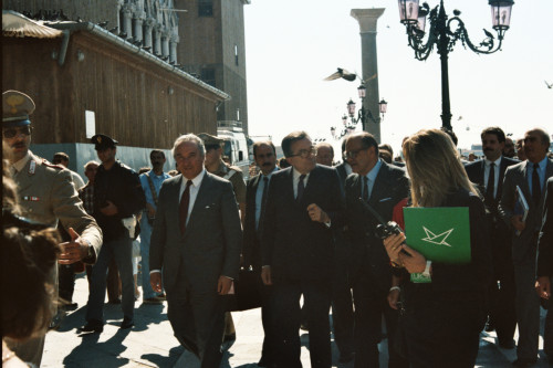 Giulio Andreotti accompagnato da Vittore Branca, alla sua destra e Carlo Bernini, Presidente della Regione del Veneto, alla sua sinistra, in occasione del Convegno internazionale "Giornate delle genti e delle regioni d'Europa" (Venezia 14-21 settembre 1986) promosso dalla Regione del Veneto con la collaborazione della Fondazione Giorgio Cini e de La Biennale di Venezia.