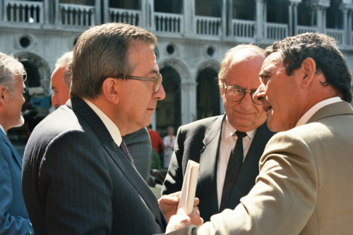 Giulio Andreotti, circondato da alcuni personaggi maschili in occasione del Convegno internazionale "Giornate delle genti e delle regioni d'Europa" (Venezia 14-21 settembre 1986) promosso dalla Regione del Veneto con la collaborazione della Fondazione Giorgio Cini e de La Biennale di Venezia.