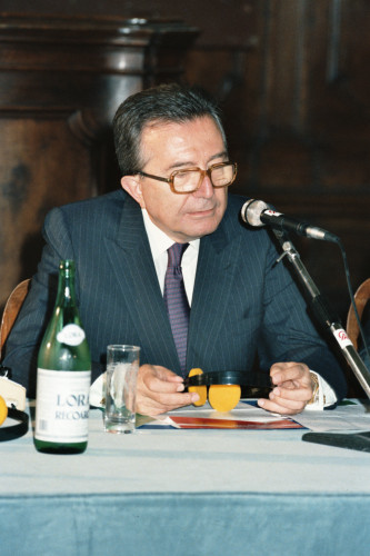 Giulio Andreotti, all'epoca Ministro degli Esteri, in occasione di un intervento durante il Convegno internazionale "Giornate delle genti e delle regioni d'Europa" (Venezia 14-21 settembre 1986) promosso dalla Regione del Veneto con la collaborazione della Fondazione Giorgio Cini e de La Biennale di Venezia.