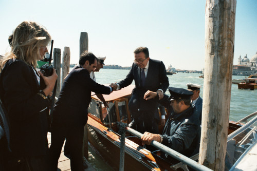 L'arrivo in un taxi acqueo di Giulio Andreotti in Piazza San Marco in occasione del Convegno internazionale "Giornate delle genti e delle regioni d'Europa" (Venezia 14-21 settembre 1986) promosso dalla Regione del Veneto con la collaborazione della Fondazione Giorgio Cini e de La Biennale di Venezia.