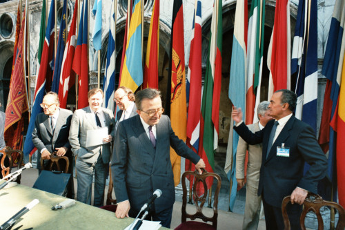 L'incontro di Giulio Andreotti con gli altri partecipanti ad una delle conferenze svolte in occasione del Convegno internazionale "Giornate delle genti e delle regioni d'Europa" (Venezia 14-21 settembre 1986) promosso dalla Regione del Veneto con la collaborazione della Fondazione Giorgio Cini e de La Biennale di Venezia.