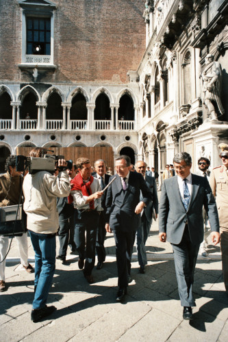 Giulio Andreotti, ripreso in Piazza San Marco accompagnato da Nereo Laroni, sindaco di Venezia (a destra) in occasione del Convegno internazionale "Giornate delle genti e delle regioni d'Europa" (Venezia 14-21 settembre 1986) promosso dalla Regione del Veneto con la collaborazione della Fondazione Giorgio Cini e de La Biennale di Venezia.