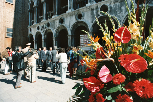 Giulio Andreotti, ripreso in Piazza San Marco accompagnato da Nereo Laroni, sindaco di Venezia (a destra) in occasione del Convegno internazionale "Giornate delle genti e delle regioni d'Europa" (Venezia 14-21 settembre 1986) promosso dalla Regione del Veneto con la collaborazione della Fondazione Giorgio Cini e de La Biennale di Venezia.