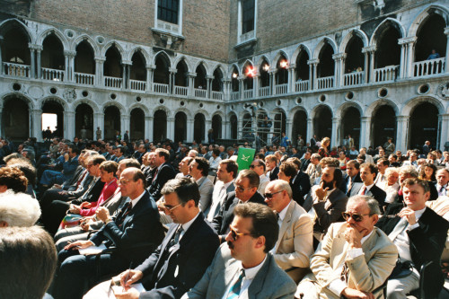 Ripresa del pubblico durante una conferenza presenziata da Giulio Andreotti, in occasione del Convegno internazionale "Giornate delle genti e delle regioni d'Europa" (Venezia 14-21 settembre 1986) promosso dalla Regione del Veneto con la collaborazione della Fondazione Giorgio Cini e de La Biennale di Venezia.