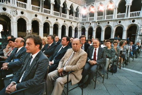 Ripresa del pubblico durante una conferenza presenziata da Giulio Andreotti, in occasione del Convegno internazionale "Giornate delle genti e delle regioni d'Europa" (Venezia 14-21 settembre 1986) promosso dalla Regione del Veneto con la collaborazione della Fondazione Giorgio Cini e de La Biennale di Venezia.