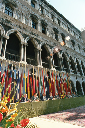 Giulio Andreotti, all'epoca Ministro degli Esteri, seduto ad un banco in occasione del Convegno internazionale "Giornate delle genti e delle regioni d'Europa" (Venezia 14-21 settembre 1986) promosso dalla Regione del Veneto con la collaborazione della Fondazione Giorgio Cini e de La Biennale di Venezia; alla sinistra di Andreotti siedono Carlo Bernini, all'epoca Presidente della Regione del Veneto e Vittore Branca.