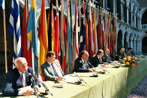 L'intervento di Giulio Andreotti in occasione del Convegno internazionale "Giornate delle genti e delle regioni d'Europa" (Venezia 14-21 settembre 1986) promosso dalla Regione del Veneto con la collaborazione della Fondazione Giorgio Cini e de La Biennale di Venezia; alla sinistra di Andreotti siedono Carlo Bernini, all'epoca Presidente della Regione del Veneto e Vittore Branca.