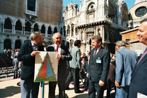 Ripresa di Carlo Bernini (al centro), insieme con altri personaggi, in occasione del Convegno internazionale "Giornate delle genti e delle regioni d'Europa" (Venezia 14-21 settembre 1986) promosso dalla Regione del Veneto con la collaborazione della Fondazione Giorgio Cini e de La Biennale di Venezia.