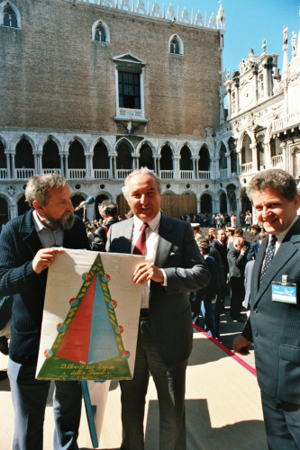 Ripresa di Carlo Bernini (al centro), insieme con altri personaggi, in occasione del Convegno internazionale "Giornate delle genti e delle regioni d'Europa" (Venezia 14-21 settembre 1986) promosso dalla Regione del Veneto con la collaborazione della Fondazione Giorgio Cini e de La Biennale di Venezia.