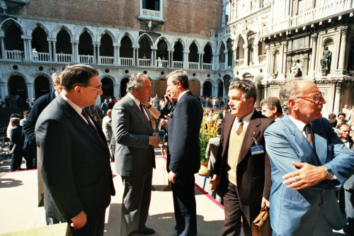 Carlo Bernini ed altri personaggi ripresi in occasione del Convegno internazionale "Giornate delle genti e delle regioni d'Europa" (Venezia 14-21 settembre 1986) promosso dalla Regione del Veneto con la collaborazione della Fondazione Giorgio Cini e de La Biennale di Venezia.