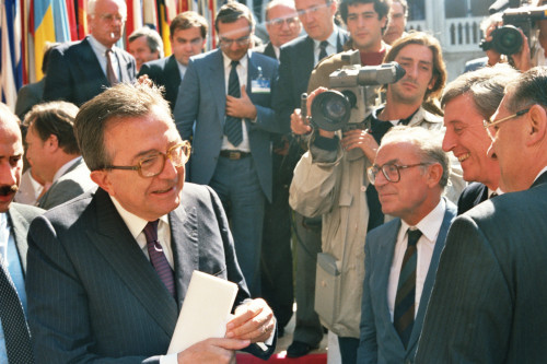 Ripresa di Giulio Andreotti circondato da un folto gruppo di persone in occasione del Convegno internazionale "Giornate delle genti e delle regioni d'Europa" (Venezia 14-21 settembre 1986) promosso dalla Regione del Veneto con la collaborazione della Fondazione Giorgio Cini e de La Biennale di Venezia.