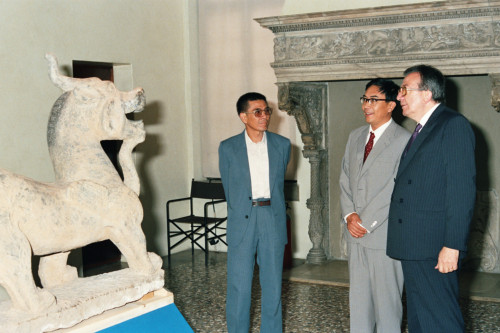 Ripresa di Giulio Andreotti ed altri personaggi durante la visita ad un'esposizione di arte orientale tenuta in occasione del Convegno internazionale "Giornate delle genti e delle regioni d'Europa" (Venezia 14-21 settembre 1986) promosso dalla Regione del Veneto con la collaborazione della Fondazione Giorgio Cini e de La Biennale di Venezia.