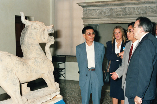 Ripresa di Giulio Andreotti ed altri personaggi durante la visita ad un'esposizione di arte orientale tenuta in occasione del Convegno internazionale "Giornate delle genti e delle regioni d'Europa" (Venezia 14-21 settembre 1986) promosso dalla Regione del Veneto con la collaborazione della Fondazione Giorgio Cini e de La Biennale di Venezia.