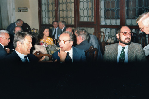 Ripresa di alcuni personaggi maschili presenti ad una cena di rappresentanza politica svolta in occasione del Convegno internazionale "Giornate delle genti e delle regioni d'Europa" (Venezia 14-21 settembre 1986) promosso dalla Regione del Veneto con la collaborazione della Fondazione Giorgio Cini e de La Biennale di Venezia.