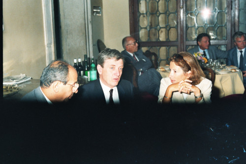 Ripresa di alcuni personaggi maschili presenti ad una cena di rappresentanza politica svolta in occasione del Convegno internazionale "Giornate delle genti e delle regioni d'Europa" (Venezia 14-21 settembre 1986) promosso dalla Regione del Veneto con la collaborazione della Fondazione Giorgio Cini e de La Biennale di Venezia.