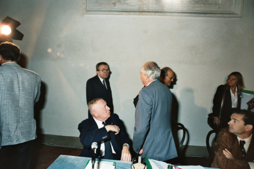 Giulio Andreotti, Vittore Branca ed altri personaggi ripresi prima di una conferenza tenuta sull'Isola di San Giorgio Maggiore in occasione del Convegno internazionale "Giornate delle genti e delle regioni d'Europa" (Venezia 14-21 settembre 1986) promosso dalla Regione del Veneto con la collaborazione della Fondazione Giorgio Cini e de La Biennale di Venezia.