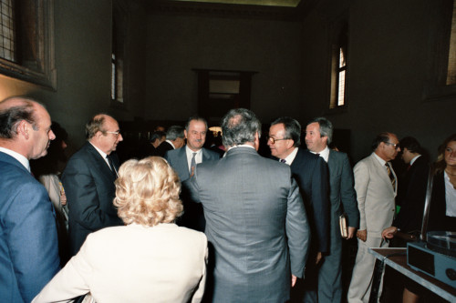 Giulio Andreotti ed altri personaggi ripresi prima di una conferenza tenuta sull'Isola di San Giorgio Maggiore in occasione del Convegno internazionale "Giornate delle genti e delle regioni d'Europa" (Venezia 14-21 settembre 1986) promosso dalla Regione del Veneto con la collaborazione della Fondazione Giorgio Cini e de La Biennale di Venezia.