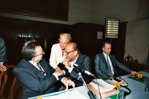 Giulio Andreotti stringe la mano a M. Lorch prima della conferenza da lui presenziata tenuta sull'Isola di San Giorgio Maggiore in occasione del Convegno internazionale "Giornate delle genti e delle regioni d'Europa" (Venezia 14-21 settembre 1986) promosso dalla Regione del Veneto con la collaborazione della Fondazione Giorgio Cini e de La Biennale di Venezia. Tra i presenti compare anche Carlo Bernini, Presidente della Regione del Veneto.
