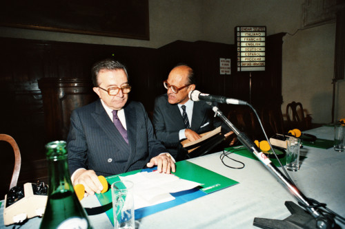 Giulio Andreotti e Vittore Branca ripresi prima dell'inizio di una conferenza tenuta sull'Isola di San Giorgio Maggiore in occasione del Convegno internazionale "Giornate delle genti e delle regioni d'Europa" (Venezia 14-21 settembre 1986) promosso dalla Regione del Veneto con la collaborazione della Fondazione Giorgio Cini e de La Biennale di Venezia.