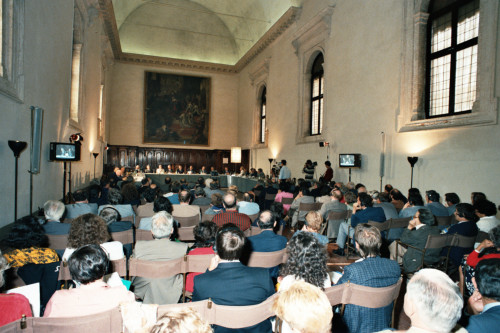 Giulio Andreotti, Carlo Bernini e Vittore Branca e gli altri partecipanti alla conferenza tenuta sull'Isola di San Giorgio Maggiore in occasione del Convegno internazionale "Giornate delle genti e delle regioni d'Europa" (Venezia 14-21 settembre 1986) promosso dalla Regione del Veneto con la collaborazione della Fondazione Giorgio Cini e de La Biennale di Venezia.