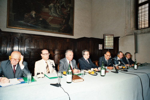 Giulio Andreotti, Carlo Bernini e Vittore Branca e gli altri partecipanti alla conferenza tenuta sull'Isola di San Giorgio Maggiore in occasione del Convegno internazionale "Giornate delle genti e delle regioni d'Europa" (Venezia 14-21 settembre 1986) promosso dalla Regione del Veneto con la collaborazione della Fondazione Giorgio Cini e de La Biennale di Venezia.
