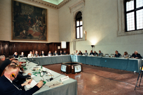 Giulio Andreotti, Carlo Bernini e Vittore Branca e gli altri partecipanti alla conferenza tenuta sull'Isola di San Giorgio Maggiore in occasione del Convegno internazionale "Giornate delle genti e delle regioni d'Europa" (Venezia 14-21 settembre 1986) promosso dalla Regione del Veneto con la collaborazione della Fondazione Giorgio Cini e de La Biennale di Venezia.