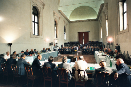 Giulio Andreotti, Carlo Bernini e Vittore Branca e gli altri partecipanti alla conferenza tenuta sull'Isola di San Giorgio Maggiore in occasione del Convegno internazionale "Giornate delle genti e delle regioni d'Europa" (Venezia 14-21 settembre 1986) promosso dalla Regione del Veneto con la collaborazione della Fondazione Giorgio Cini e de La Biennale di Venezia.
