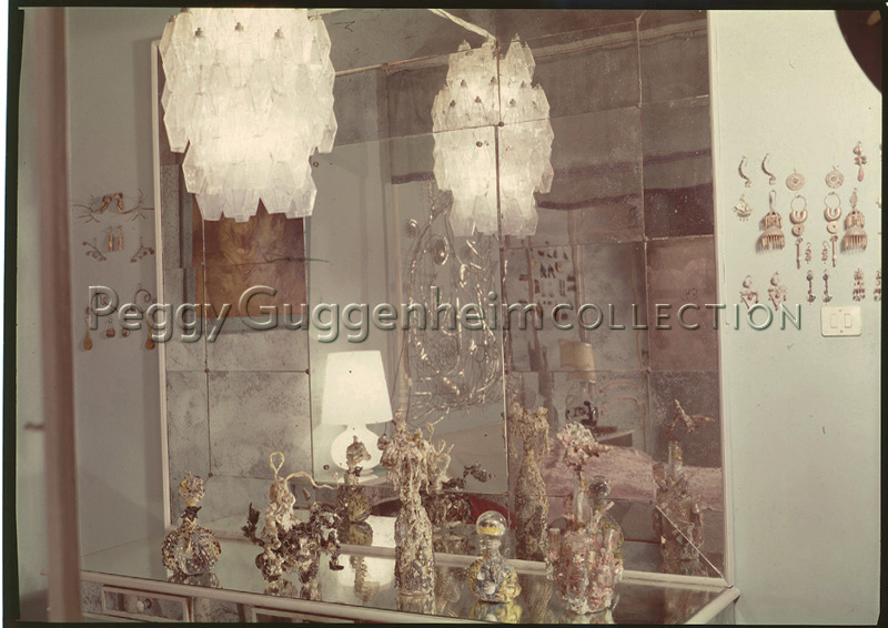 Alcune opere di Laurence Vail (PG293, PG292, PG290, PG289, PG288) appoggiate sul tavolo da toletta, nella camera da letto di Peggy Guggenheim a Palazzo Venier dei Leoni. Alla parete si intravvede appeso il dipinto di Franz von Lenbach che la ritrae bambina, con la sorella Benita (1903 ca.). Accanto alla specchiera sono appese alcune paia di orecchini della sua collezione. Venezia, anni '70.