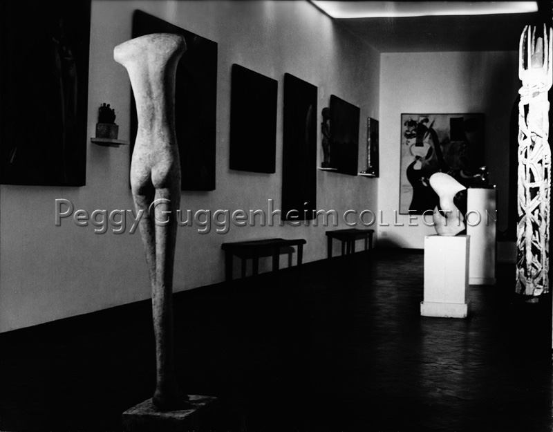 Alcune opere della collezione di Peggy Guggenheim esposte nella barchessa di Palazzo Venier dei Leoni. Alla parete di sinistra sono appesi sei dipinti di Max Ernst e sulla parete di fondo quello di Mirò. Sui piedestalli bianchi sono posate le sculture di Arp, mentre in primo piano si riconosce quella di Giacometti. A destra e tra i dipinti della parete opposta sono inserite alcune sculture della collezione di arte etnica; Venezia, anni '60.