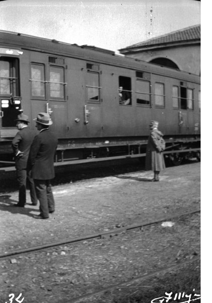Un ufficiale saluta un bambino in partenza su un treno.