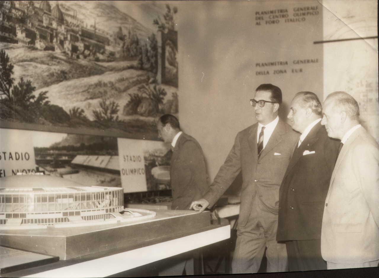 Il presidente dell'Ente Provinciale per il Turismo Avv. Luigi Merlin ( a sx) mentre illustra al Presidente dell'Unione Velocipedista Italiana Comm. Adriano Rovoni (al centro)la mostra sulle olimpiadi nella sala della Ragione.