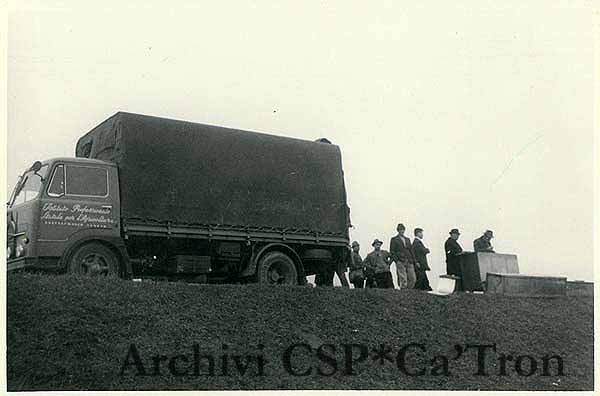 Un camion, lungo un argine, consegna casse e sacchi di viveri e vestiario alle famiglie alluvionate del Veneto