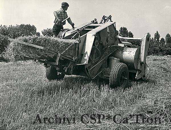 Fasi finali della mietitura del frumento. Sul campo si preparano le balle di paglia con la mietitrebbia.