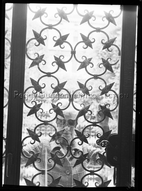 Peggy Guggenheim dietro la porta finestra della terrazza Marini del Palazzo Venier dei Leoni. Peggy indossa gli occhiali a forma di farfalla creati per lei da Edward Melcarth, dietro di lei il Canal Grande.