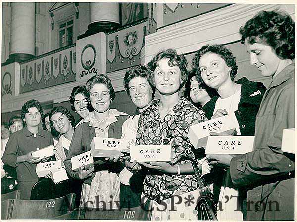 Un gruppo di donne posa sorridente dopo la consegna del pacco dono Care U.S.A nell'occazione del convegno CEPES al teatro di Castelfranco Veneto.