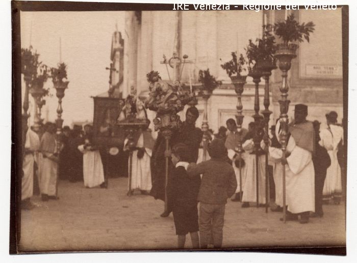 I confratelli, già disposti in due ali, reggono i segnali processionali e lo stendardo poco prima di inziare il corteo. Due bambini piccoli si sono avvicinati per guardare più da vicino il segnale ligneo.