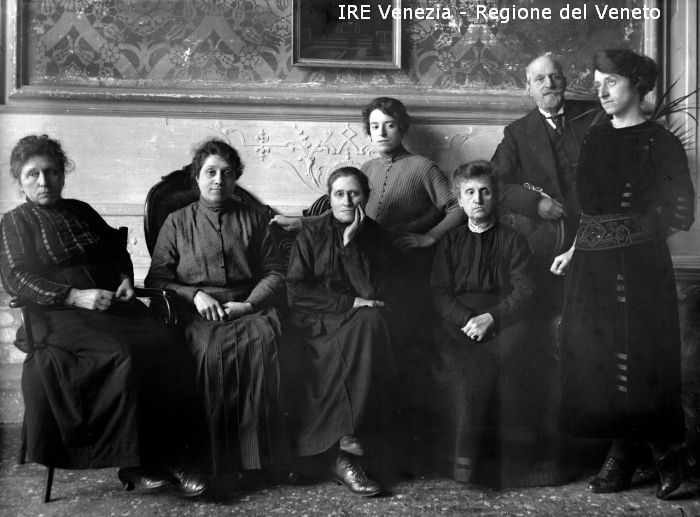 Quattro donne sedute tra le quali si riconosce da sinistra Stella Filippi, Ida Filippi, Angela Vorano con la mano che sorregge il viso e le gambe incrociate ed Elisa Filippi. In piedi da destra Clara Filippi, Tomaso Filippi appoggiato allo schienale di una poltroncina, ed Elvira Filippi.