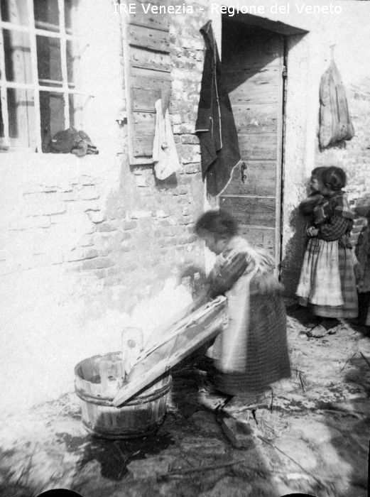 Una bambina piccola che fa il bucato fuori dalla sua abitazione