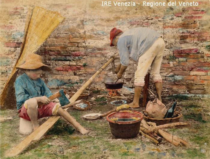 Due piccoli pescatori sono seduti sull'erba vicino ad un muro e mentre uno, con cappello a tesa larga, siede su un pezzo di marmo e con un'ascia scolpisce un pezzetto di legno, l'altro, in piedi, con un berretto rosso, è chino sulla pentola nella quale sta cuocendo del cibo. La pentola pende con dello spago da un remo rotto, poggiato al muro. Vicino ai due ragazzi ci sono pentole, cesti di vimini, piatti con sardine e un pentolone in primo piano nel quale è intuibile sia stata cucinata della polenta.