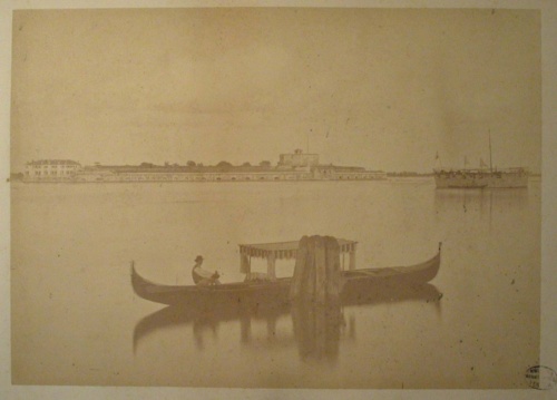 Venezia. In primo piano un'imbarcazione a remi, attraccata ad una bricola con il vogatore seduto a poppa, a riposo. In secondo piano si vedono il Forte di Sant'Andrea, situato sull'isola omonima, e un'altra imbarcazione.
