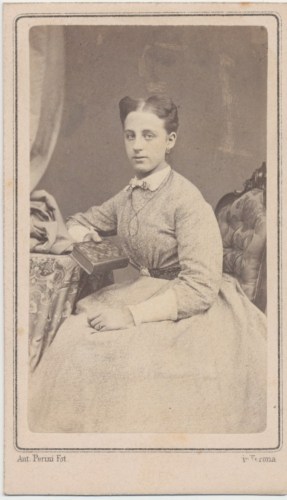 Ritratto di una donna, con un libro stretto nella mano destra, seduta su una poltrona e appoggiata ad un tavolino.