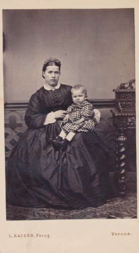Ritratto di donna seduta, a figura intera, che stringe in braccio una bambina.