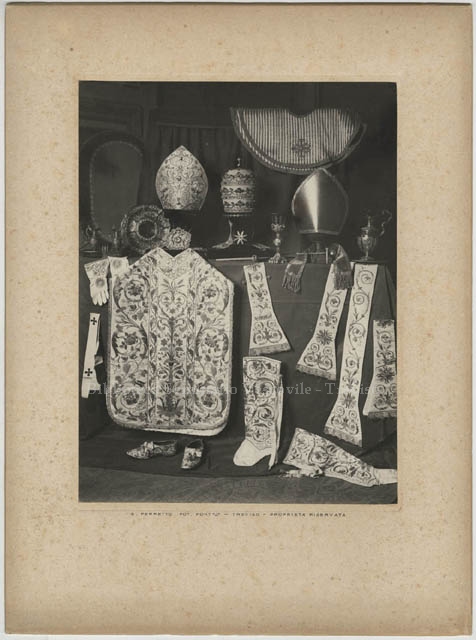 Paramenti indossati da papa Pio X, in occasione dell'incoronazione: razionale; mitre e triregno; ampolline, vassoio, tavola pel bacio della pace, asterisco, fistula, calice, cucchiaio, spille, mesciacqua; guanti, pallio, pianeta, pantofole, manipoli, stola e calze.