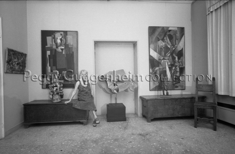 L'immagine ritrae Peggy Guggenheim in piedi immersa in un folto gruppo di opere della sua collezione privata.