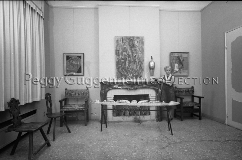 L'immagine ritrae Peggy Guggenheim a Palazzo Venier dei Leoni in piedi accanto all'opera di Constantin Brancusi "Maiastra" (1912, Peggy Guggenheim Collection) poggiata sul camino. In primo piano posizionata su di un cavalletto vediamo "Intaglio funerario" della collezione di Sculture dall'Oceania. Appese al muro da sinistra: Juan Gris "Bottiglia di rum e giornale" (1914, Peggy Guggenheim Collection), Pablo Picasso "Il poeta" (1911, Peggy Guggenheim Collection), Pablo Picasso "Pipa, bicchiere, bottiglia di Vieux Marc" (1914, Peggy Guggenheim Collection).