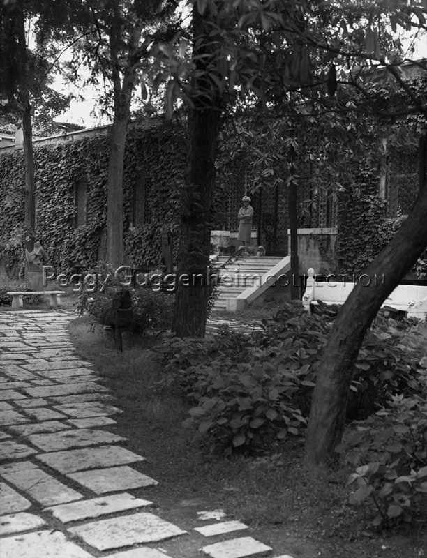 Peggy Guggenheim nel giardino di Palazzo Venier dei Leoni. Peggy indossa gli occhiali a forma di farfalla creati per lei da Edward Melcarth.