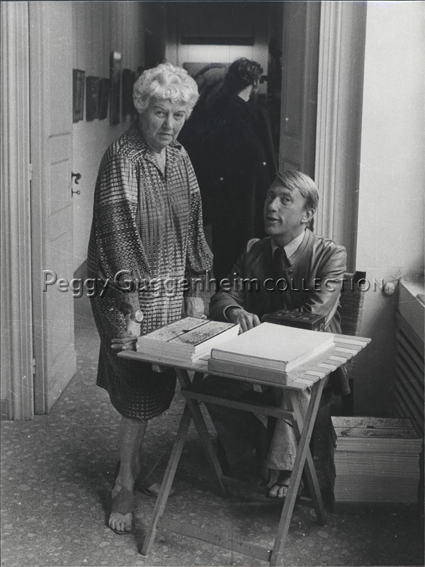 Peggy Guggenheim accanto a John Hohnsbeen (studioso, storico dell'arte, segretario di Peggy negli anni '70) seduto al tavolo dei cataloghi durante un'esposizione a Palazzo Venier dei Leoni, fine anni '70.