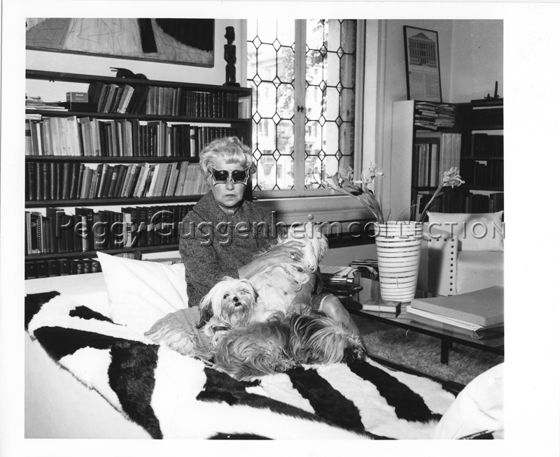 L'immagine ritrae Peggy Guggenheim nella sua biblioteca a Palazzo Venier dei Leoni. Peggy, che indossa gli occhiali a forma di pipistrello creati per lei da Edward Melcarth, è seduta sul divano insieme a tre dei suoi cani di razza Lasha Apsos Terrier. In alto a sinistra si vede in parte l'opera di William Congdon "Piazza San Marco" (1957, Peggy Guggenheim Collection), mentre all'estrema destra sopra lo scaffale è collocata una stampa del progetto di completamento di di Palazzo Venier dei Leoni. La stanza è arredata poi da due sculture facenti parte della collezione di arte primitiva di Peggy e da "Modello per una piazza" di Alberto Giacometti (1931-32, Peggy Guggenheim Collection) collocato sopra l'ultima mensola alla destra dell'immagine.
